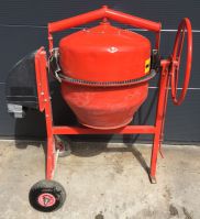 Betonmischer Rot "HM P 165 L" Motorleistung 700 Watt/ 230 V, Mischleistung 130 Liter, mit Handrad und umweltfreundlicher sowie witterungsbeständiger Pulverbeschichtung, Kunststoffmotorhaus mit Schutzklasse, IP 45 = strahlwassergeschützt, patentierte Hochleistungsmischrechen, Antrieb über ein einstellbares Gussritzel, Nullspannungsauslöser.